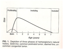 Most often, hemangiomas are not present or noticeable at birth. Within first one to two months, however, the red marks become visible (Initial macular blemish). From first month to the age of six to twelve months, they generally grow rapidly. (Proliferating phase). After this period, their growth slows down and around twelve to eighteen months they begin to shrink or ‘involute‘. Thirty percent of hemangiomas disappear on their own by the time the child is three years old and 50% are gone by the 5th birthday. By the time child reaches the age of nine years, 80-90% are gone. In all, approximately half resolve completely without any form of treatment and without leaving residual marks. (Fig. 1)